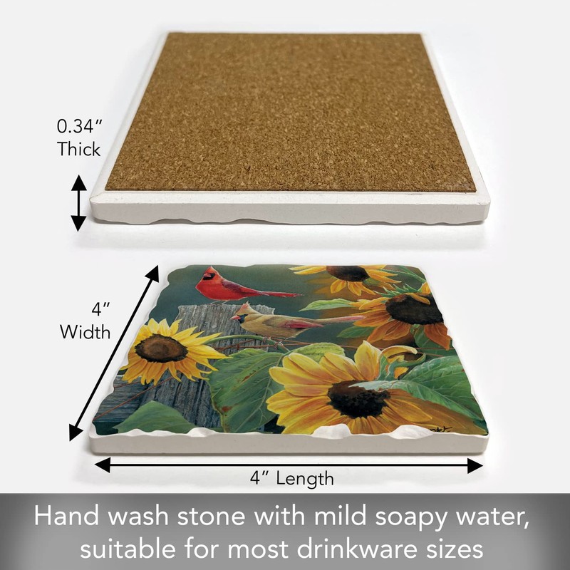Thirstystone Cardinal & Sunflowers Single Tumbled Tile Stone Coaster with Protective Cork Backing Manufactured in The USA 4" Square, Artistic, Easily Wipes Clean