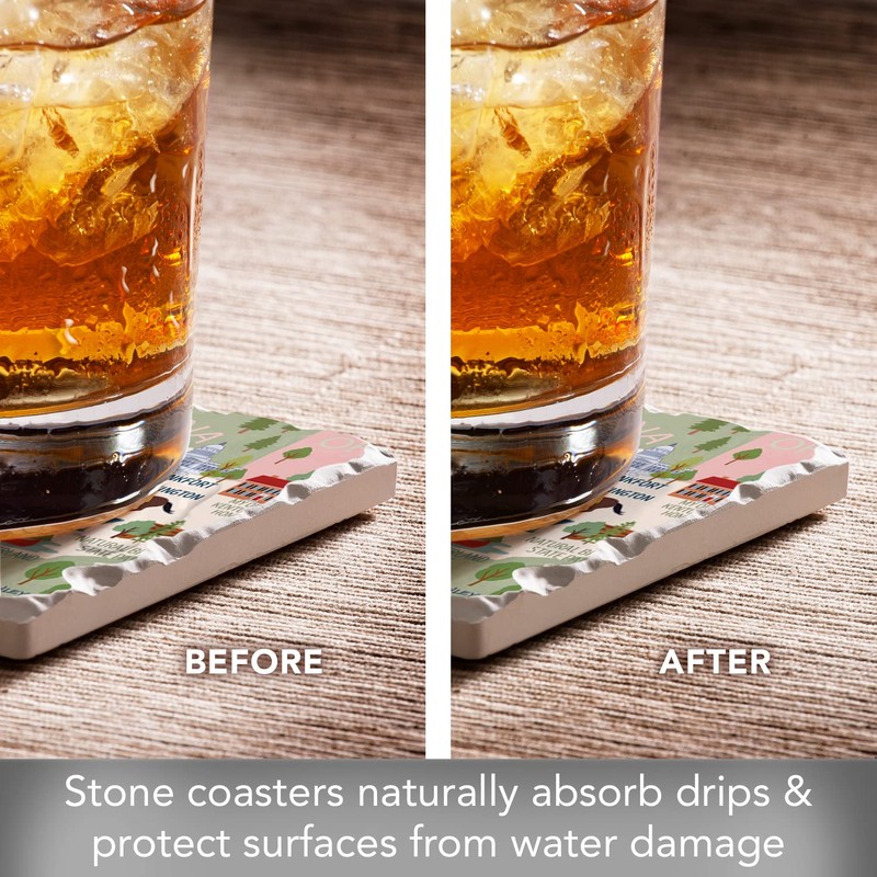 - ABSORBENT STONE Coasters arrive as a set of 4 Coasters. Each Coaster is constructed of absorbent stone that continuously absorbs drips and condensation from your beverages while preventing stains and rings on your furniture.