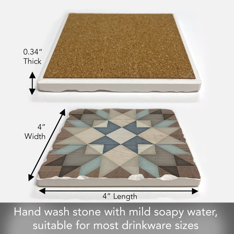 - ARTISTIC DESIGN-Beautiful artistic design allows the Coaster to remain displayed even when not in use. Each Coaster measures 4” x 4” x .25”. Sized to fit larger Mugs & Glasses.
