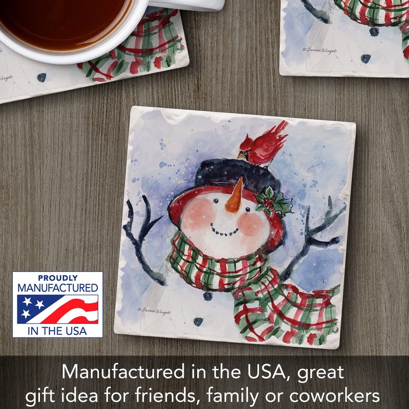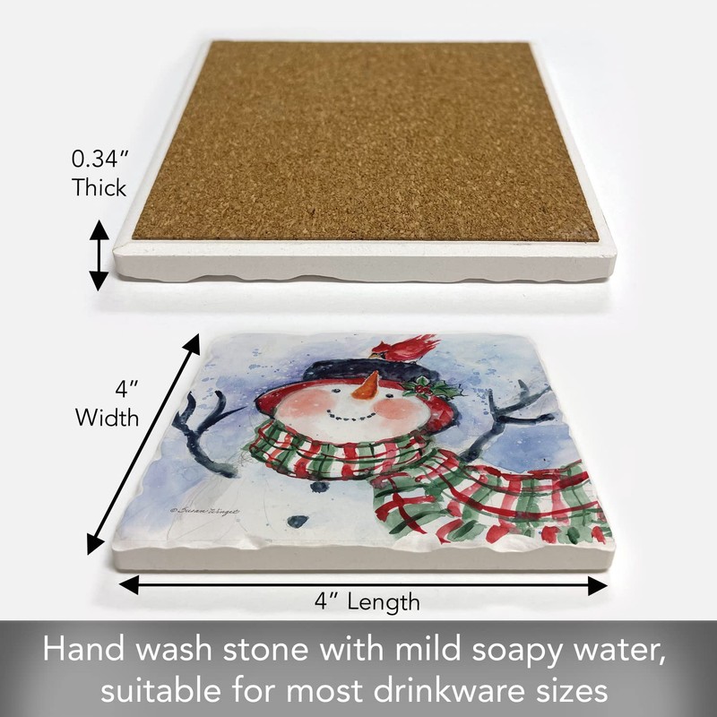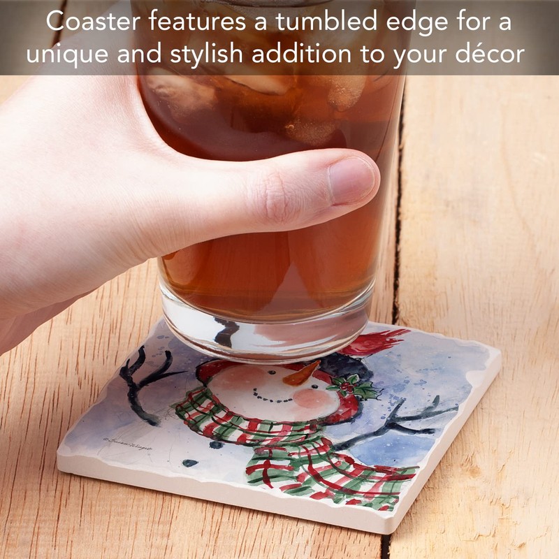 Thirstystone Snowman in Green Plaid Scarf Single Tumbled Tile Stone Coaster with Protective Cork Backing Manufactured in The USA 4" Square, Artistic, Easily Wipes Clean