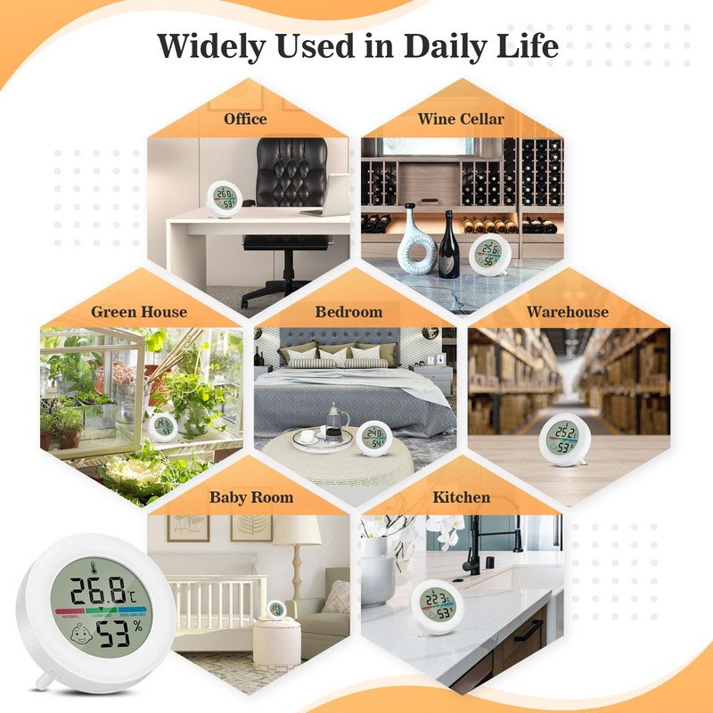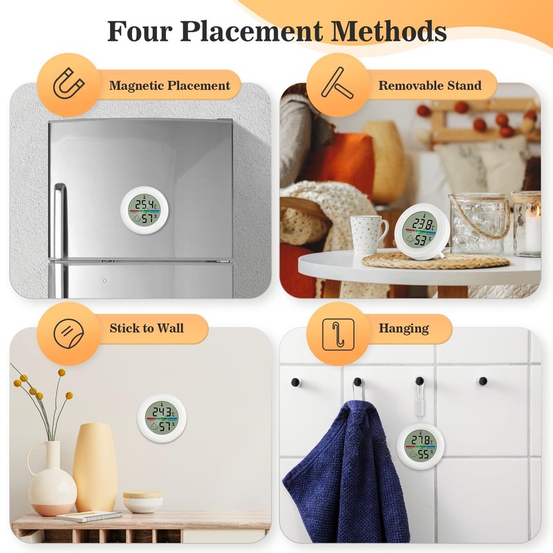 - Easy to Install The humidity thermometer has four installation options: table stand, magnetic back, glue, hanging rope. Widely used in rooms, greenhouses, wardrobes, wine cellars, warehouses, grain stores.