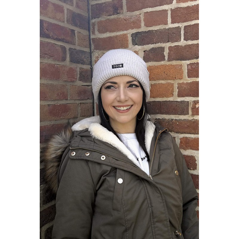 The hat has a turnover cuff, so you can wear the hat cuff turned over or you can straighten the hat out to give you some extra length. On the cuff is the black THMO badge stitched into the front of the hat. The cuff also hugs the side of your head firmly so that heat can not escape though the sides.