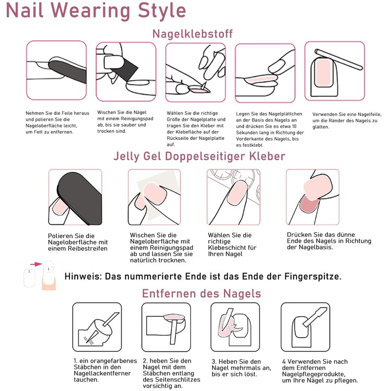 - Package includes: 1 box of 24 long press nails, 24 pieces jelly glue, 1 mini nail file, 1 ml glue, 1 cleaning cotton pad, 1 wooden stick. A complete set of tools can give you a better complete solution for manicure.