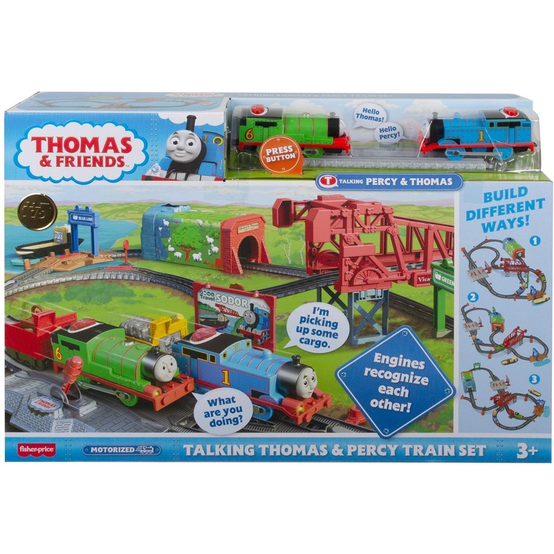 - Motorized Thomas and Percy engines stop to talk with each other when they meet on the track, and both have cargo cars for loading and unloading