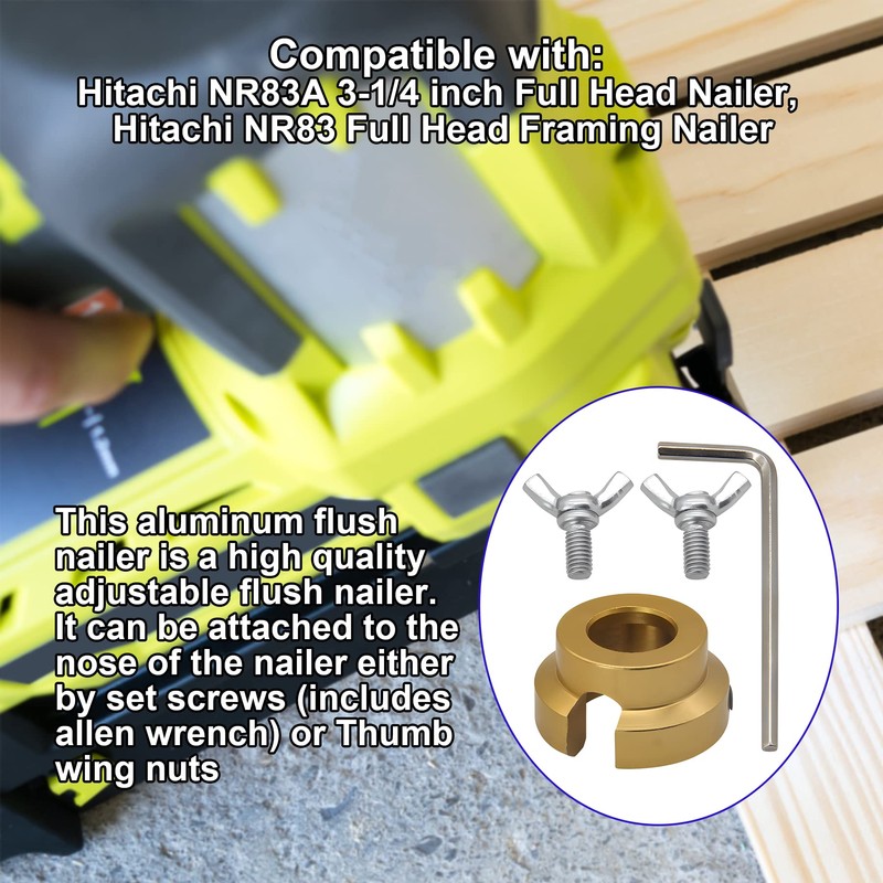 This aluminum flush nailer is a high quality adjustable flush nailer. It can be attached to the nose of the nailer either by set screws (includes allen wrench) or Thumb wing nuts