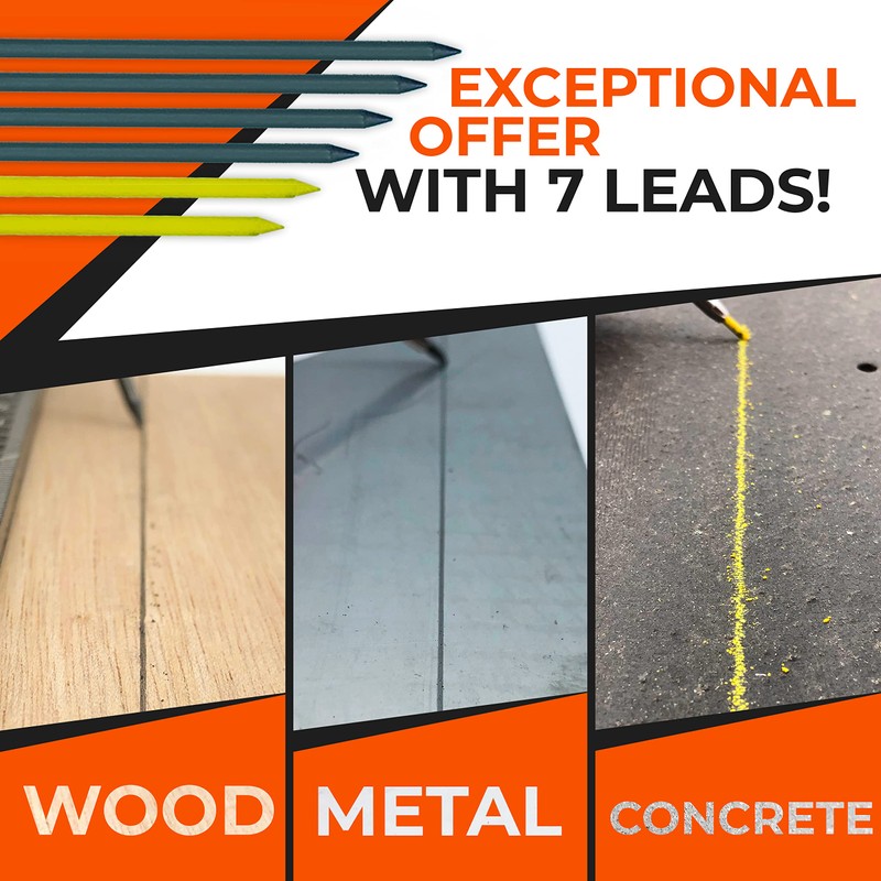 • ✅WRITE ON WOOD, METAL BUT ALSO CONCRETE AND TILES: Are you having a hard time tracing on concrete and metal? Writing on a dark surface is no longer a problem thanks to the yellow leads provided with the construction pen! What's more, the included leads are perfect for tracing anywhere and stronger than dry leads. This makes it the ideal construction pencil for carpenters, masons, and the like, as well as for all other trades!