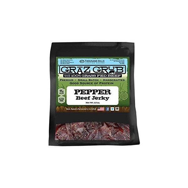 Thousand Hills Lifetime Grass Jerky Beef Pepper 2oz Pack of 12 - Spice up your snack time with Thousand Hills Lifetime Grass's Pepper Beef Jerky, a pack of 12 2 oz bags of savory and peppery jerky, crafted from high-quality grass-fed beef for a satisfying munch.