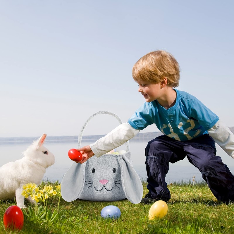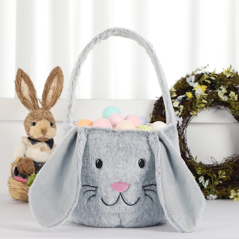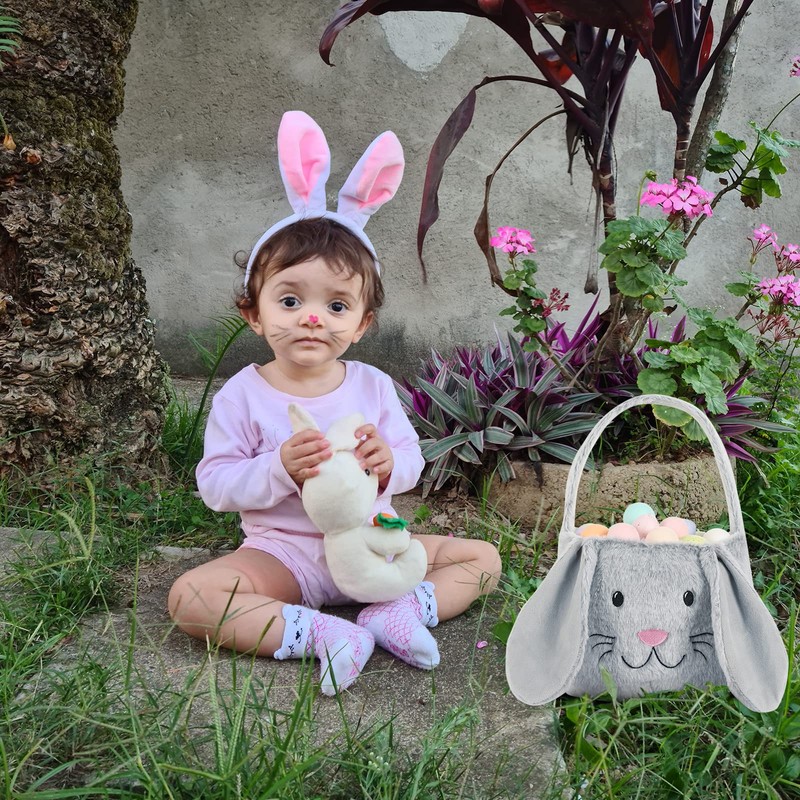 THOVSMOON THOVSMOON Easter Bunny Basket,Cute Easter Bucket Bags with Rabbit Ears for Easter Eggs Hunting,Easter Decorations,Candy Gifts Storage (Grey/White)