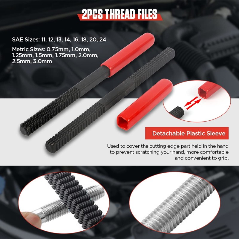 - 【2PCS SAE & Metric Thread File with Detachable Plastic Cap】Our thread repair kit comes with 2pcs SAE and Metric thread files. SAE Sizes: 11, 12, 13, 14, 16, 18, 20, 24. Metric Sizes: 0.75mm, 1.0mm, 1.25mm, 1.5mm, 1.75mm, 2.0mm, 2.5mm, 3.0mm. The 2 thread files are equipped with a detachable plastic sleeve to cover the cutting edge part held in the hand to prevent scratching the hand during use, and make it comfortable to hold and convenient to use.