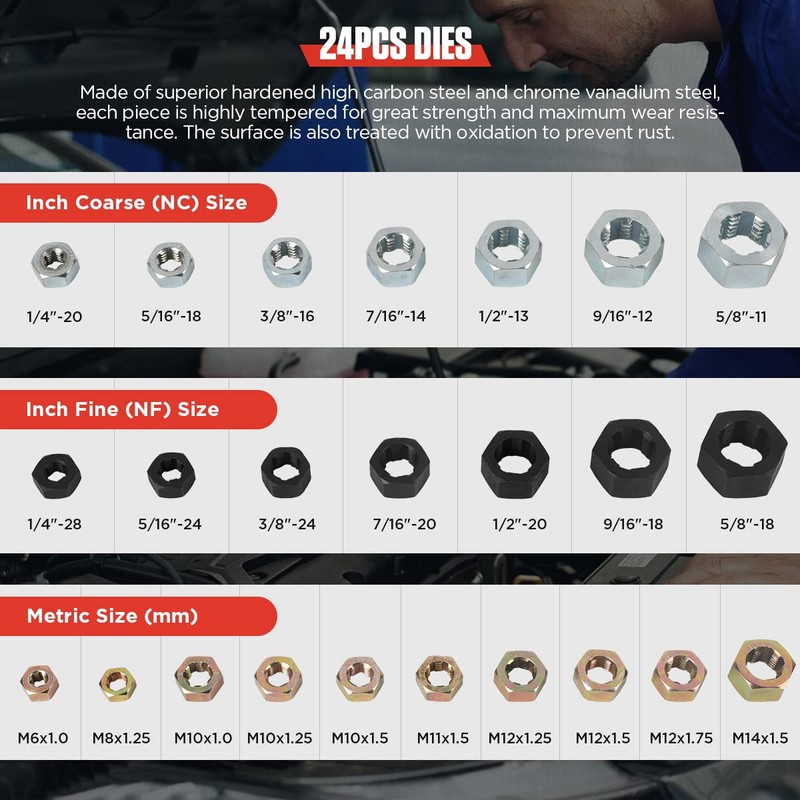 - 【24PCS Rethreading Dies】7pcs Inch Coarse sizes (silver): 1/4"-20, 5/16"-18, 3/8"-16, 7/16"-14, 1/2"-13, 9/16"-12, 5/8"-11; 7pcs Inch Fine sizes (black): 1/4"-28, 5/16"-24, 3/8"-24, 7/16"-20, 1/2"-20, 9/16"-18, 5/8"-18; 10pcs Metric sizes(gold): M6x1.0, M8x1.25, M10x1.0 M10x1.25, M10x1.5, M11x1.5, M12x1.25, M12x1.5, M12x1.75, M14x1.5mm.