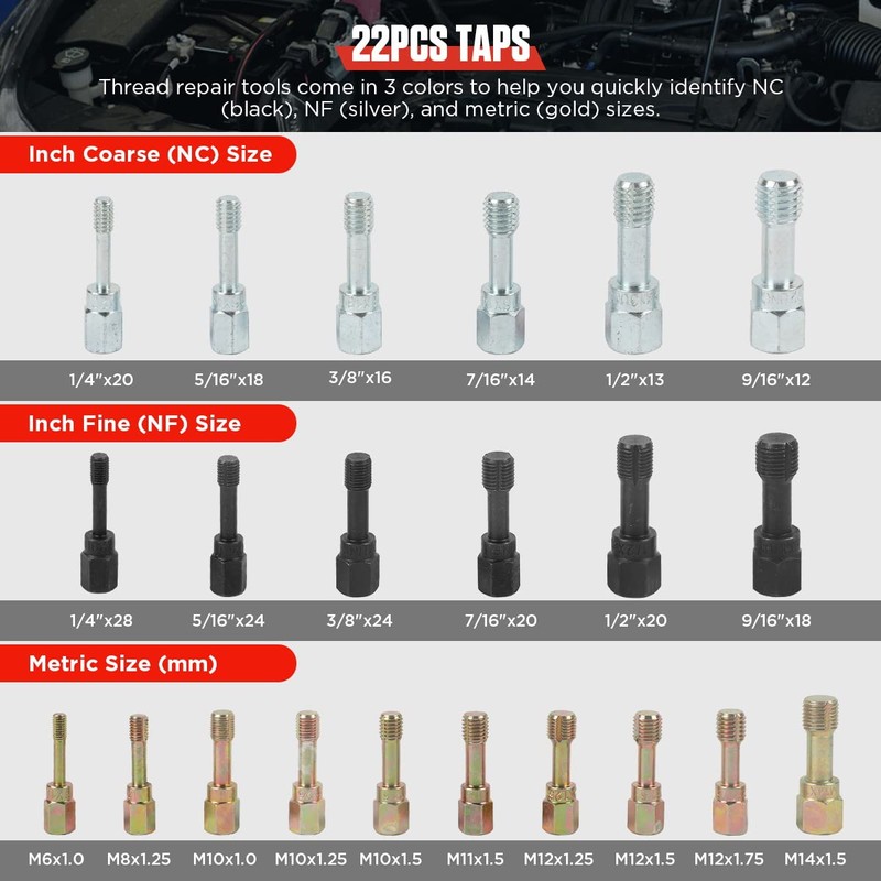 - 【22PCS Rethreading Taps】6pcs Inch Coarse sizes (silver):1/4"x20, 5/16"x18, 3/8"x16, 7/16"x14, 1/2"x13, 9/16"x12; 6pcs Inch Fine sizes (black): 1/4"x28, 5/16"x24, 3/8"x24, 7/16"x20, 1/2"x20, 9/16"x18; 10pcs Metric sizes(gold): M6x1.0, M8x1.25, M10x1.0, M10x1.25, M10x1.5, M11x1.5, M12x1.25, M12x1.5, M12x1.75, M14x1.5mm.