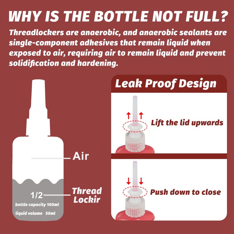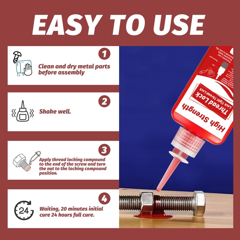 - Sealing and Rustproof - The thread lock achieves tight touch and perfect sealing, effectively preventing leakage, rust, and corrosion, and eliminating the need to stock up on expensive locking nuts and washers. Lock tight with shock and vibration resistance, it is a must-have for extending screw life and safety use