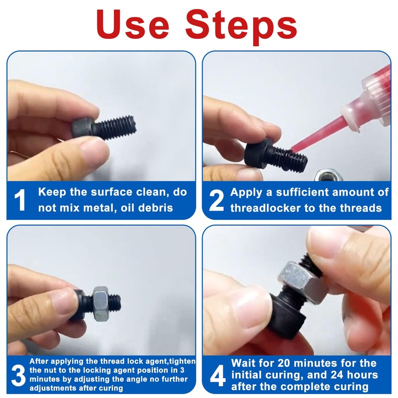 - Use Steps: 1.Keep the surface clean, do not mix metal, oil debris, 2.Apply a sufficient amount of threadlocker agent at the end of the screw, 3.After applying the thread lock blue agent, tighten the nut to the locking agent position in 3 minutes by adjusting the angle, no further adjustments after curing, 4.Wait for 20 minutes for the initial curing, and 24 hours after the complete curing, which prevents loosening and rust and corrosion