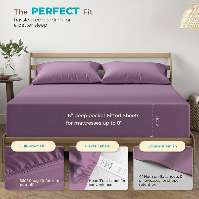- What Comes In The Set?: Our Twin XL Size Sheet Set Has 3 Pieces: 1 Top Flat Sheet (66” W x 96” L), 1 Fitted Bottom Sheet (39” W x 80” L + 16"), and 1 Standard Size Pillowcase (21” W x 32” L). The fitted sheet has deep pockets to fit adjustable mattresses from 8 inches to 16 inches deep. Clever HEAD/FOOT Tags help you to make the bed easily. Pair this Plum cotton sheet set with a matching comforter and duvet cover to elevate the home/room decor