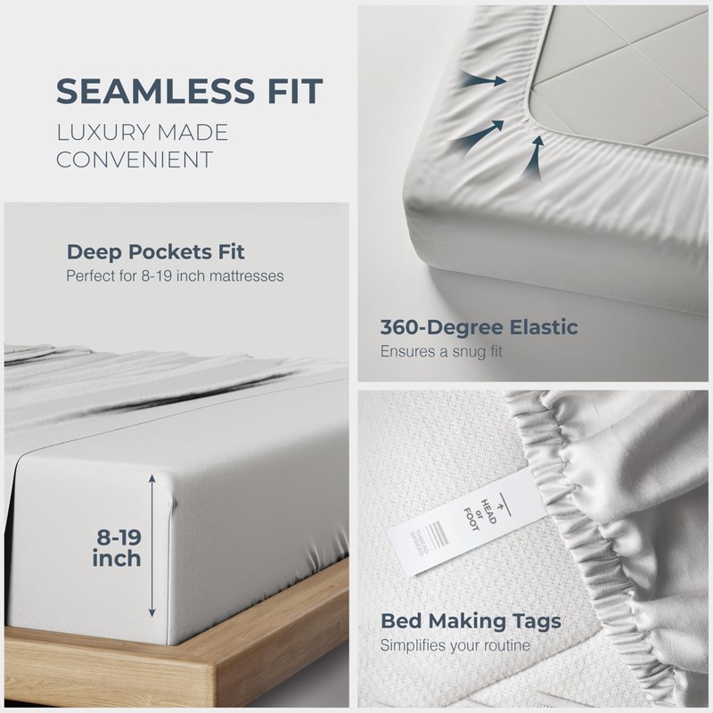 - Tailored to Perfection for a Seamless Fit on Your Mattress: Precision-engineered for a flawless fit, Thread Spread’s Egyptian cotton sheet set features an elasticized fitted sheet with deep 17-inch pockets, effortlessly accommodating standard and tall mattresses up to 19 inches. Embracing every curve of your bed with finesse, our 4-piece high thread count queen sheet set comprises 1 flat sheet (108" x 102"), 1 fitted sheet (78" x 80" + 17" + deep pocket), and 2 pillow cases (21" x 41")