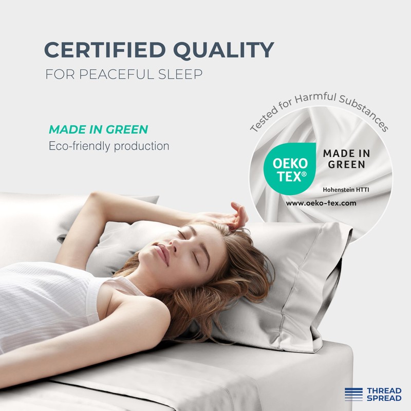 - Exclusively Authenticated for Exemplary Quality and Purity: At Thread Spread, we uphold the highest standards of excellence and authenticity. Each queen bedsheets set undergoes meticulous mercerization, imparting genuine softness and durability. Independently validated by OEKO-TEX, our deep pocket luxury queen sheets are certified free from harmful substances, ensuring a peaceful and luxurious sanctuary for you and your loved ones