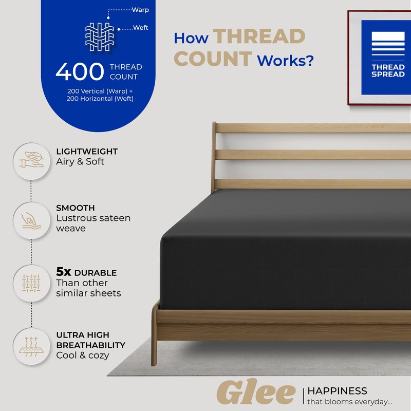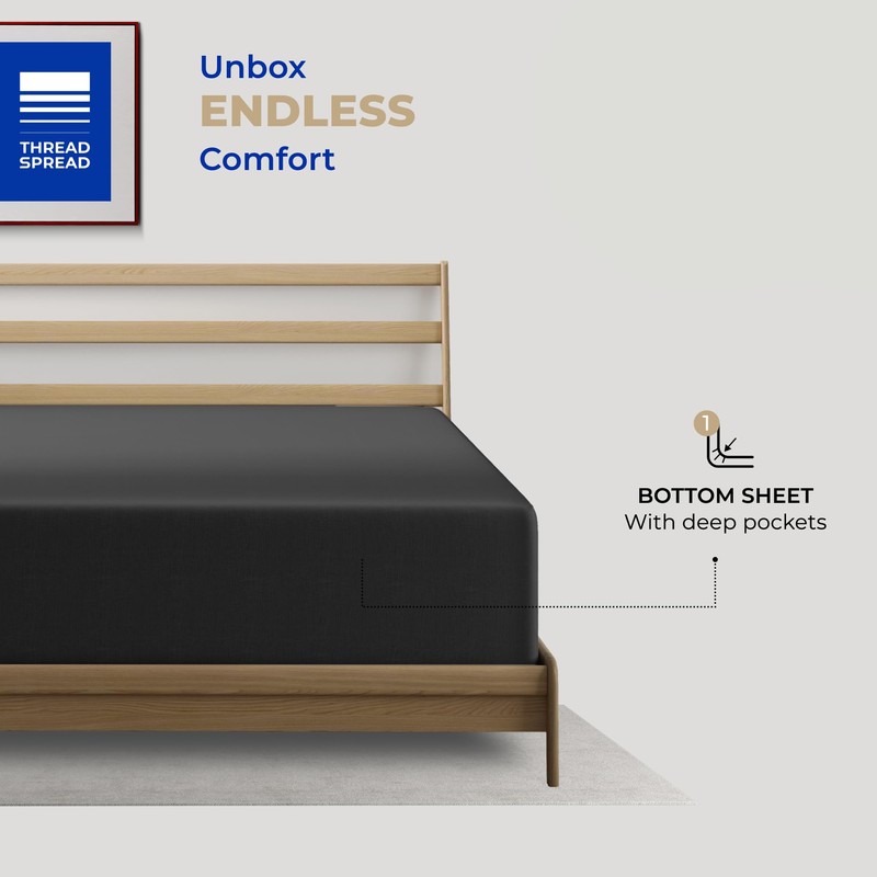 THREAD SPREAD Queen Size 100% Cotton 400 Thread Count Deep Pocket Fitted Sheet, Cooling Bottom Sheet, Fits Mattress Upto 18" - Black