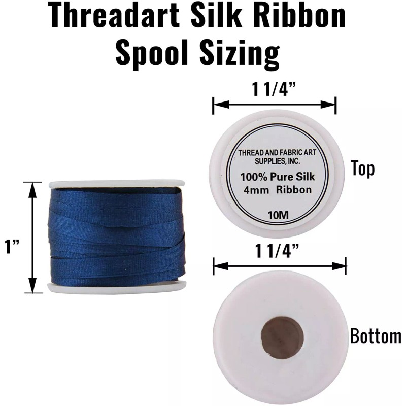 Beautiful 100% silk ribbon in a rainbow of colors. Threadart pure 100% silk ribbon is the highest quality ribbon available. This brand new, high quality silk ribbon can be used in all your arts and crafts projects including silk ribbon embroidery, crazy quilting, scrapbooks, dolls and more. The ribbon comes on spools pictured for convenient storage. Available in 50 colors and 3 widths: 2mm, 4mm, and 7mm. Each spool has 10 meters (11 yards) of ribbon. Great for all your projects.