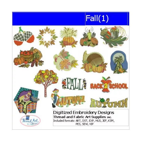 - Machine embroidery design set with 15 different designs included. Set is designed for 4x4" hoops and includes all 9 popular formats: ART, DST, EXP, HUS, JEF, KSM, PES, SEW, VIP. Designs Scarecrow, Cornucopia, Autumn Harvest, Autumn Candle and Pumpkin & Wheat are not available in SEW format. Convenient for those with multiple machines.