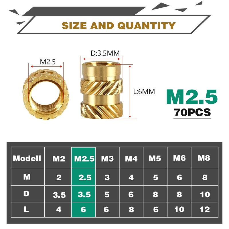 Threaded Insert, Press-in Nuts, Brass Embedding Nuts, Knurled Nuts, Threaded Inserts for Plastic Parts by Heat or Ultrasonic in 3D Printer Parts (M2.5 x 6 x 3.5 mm - 70 Pieces)
