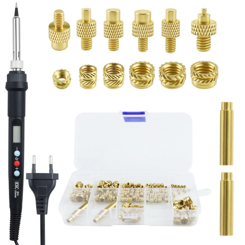 - 139 pieces threaded inserts soldering iron kit: 80 W temperature adjustable soldering iron with 130 pieces 6 sizes brass thread inserts (M2 x 30 pieces, M3 x 30 pieces, M4 x 30 pieces, M5 x 20 pieces, M6 x 10 pieces, M8 x 10 pieces), with 6 soldering tips designed for thread use. den;with 2 Piece soldering tip adapter; the threaded inserts soldering tip set, with which plastic parts are melted by heating with a soldering iron to install the thread insert into important components