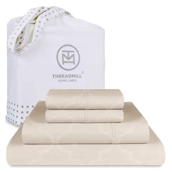 Threadmill Cotton Full Size Sheet Set | 100% Cotton Sheets for Full Size Bed | Damask Jacquard Full Bed Sheets Set with 16” Deep Pocket | Soft Sateen Weave 4-Piece Cooling Bedding Set | Beige