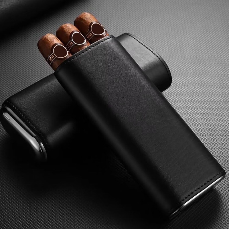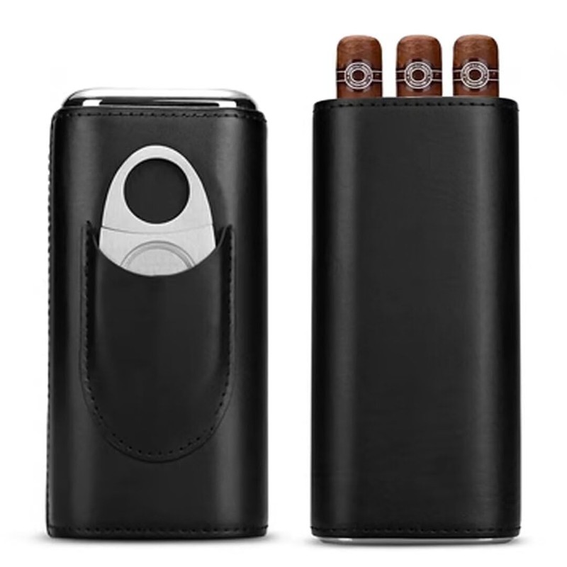 Three-Finger Portable Cigar Humidor Leather Case with Silver Cigar Cutter(Black)