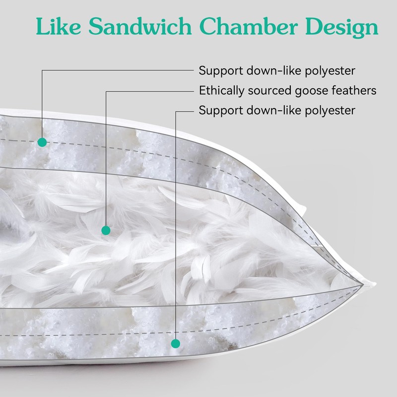 - THREE CHAMBER DESIGN-The pillow has an inner chamber filled with 60%goose feathers, providing support & volume. The two outside chambers are filled with high quality 40%polyester, making them particularly cuddly.