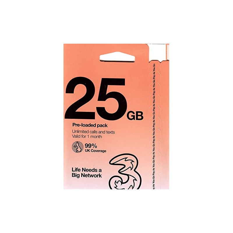 Three UK Travel SIM Card 30 Days - 25GB 5G Data in UK + 12GB Roaming in 71 Countries - Unlimited UK Calls & Texts