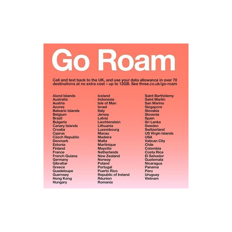 • 30 days of unlimited calls, texts, 25Gb data in UK and 12Gb of data can be used in all 71 Go Roam destinations at no extra cost. Unlimited voice mins and Unlimited texts can ONLY be used to call UK numbers, AND European numbers while you are in Europe.