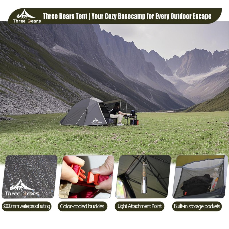 ThreeBears 4-Person Backpacking Tent Shelter, 3000mm Waterproof, Easy Setup, Spacious for Family Outdoor Adventures, Hiking, and Camping Trips