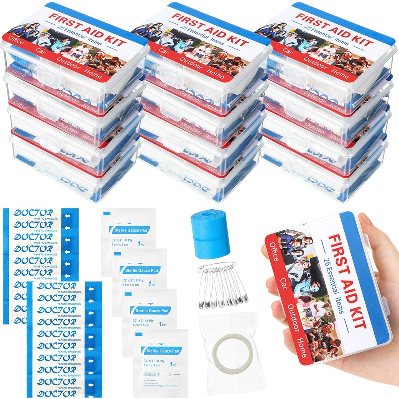 Package includes: 12 Set first aid kits: 1 x Plastic box 1 x Roll of non-woven tape 4 x Gauze 10 x Bandages 10 x Safety pins 1x Hemostatic band 1 x Adhesive stickers Notes: Manual measurement, please allow slight errors on size. The color may exist a slight difference due to different screen displays.