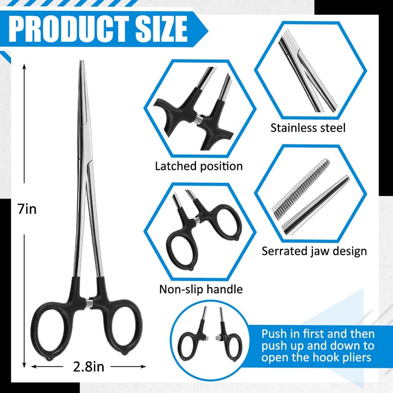 - Package Includes: our set provides one curved and one straight hemostats, about 7 inches long and 2.9 inches wide, suitable for carrying in a tackle box; These multi purpose fishing pliers can be applied to clamp barbs, tie knots, and remove fish hooks, and are essentials for most fishing enthusiasts