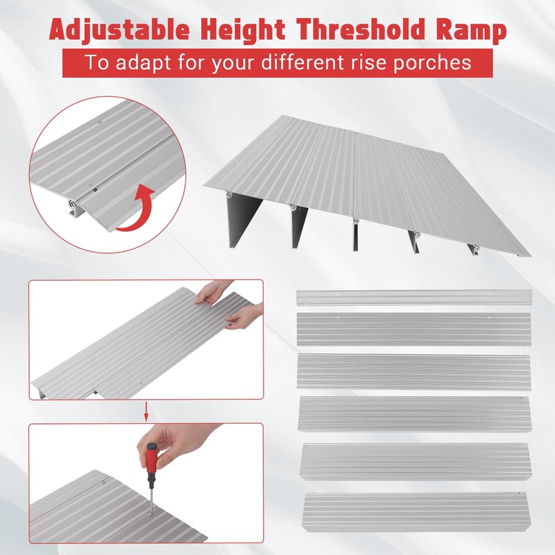 - ADJUSTABLE HEIGHT: All size of ramps have an adjustable stopper which is attached to the top of the ramp. The sections of the threshold ramp can be connected or detached to achieve height adjustment to meet your different needs. NOTE: The 5" rise ramp can be adjusted to 1"/2"/3"/4" rise.