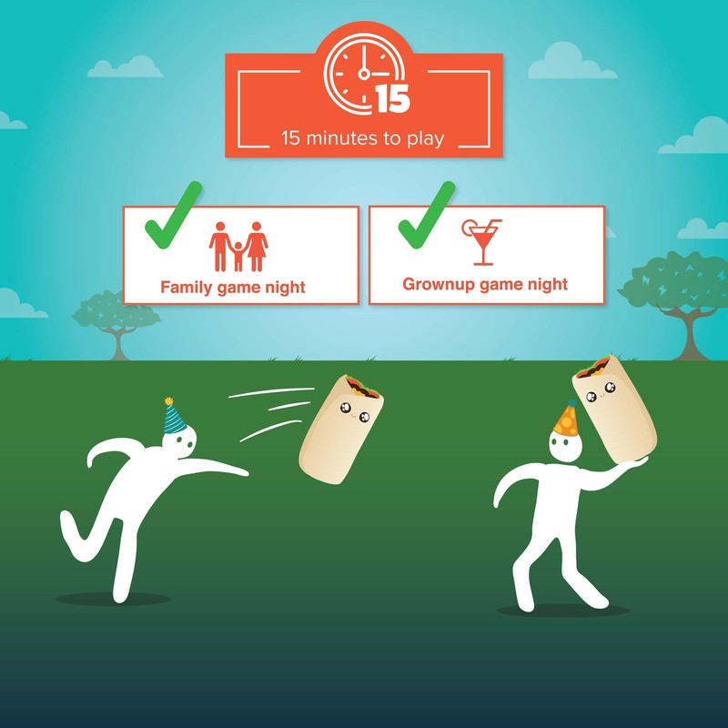 - Try to collect matching sets of oversized cards faster than your opponents while simultaneously ducking, dodging, and throwing 3-foot tall inflatable burritos. The cards you collect earn points, but getting hit by flying giant burritos loses them.