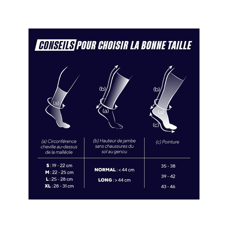 - Choice of sizes: The Thuasne Sport Running Trail Sleeves are available in 4 sizes (S, M, L, XL) depending on the ankle circumference and in 2 heights, normal (<44 cm) and long (> 44 cm), depending on leg height. Our size chart will help you choose the right sleeves for your physique. Composition: Elastane, Polyamide, Polyester. Machine washable at 40°C.