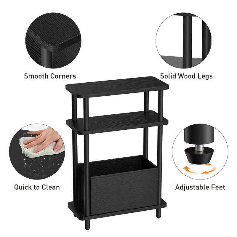 THUMEYE Narrow Side Table with Fabric Basket, 7" Wide, 3 Tier Skinny End Table with Wood Legs, Slim Nightstand/Bedside Table for Small Spaces, with Adjustable Feet, 15.7" L x 23" H
