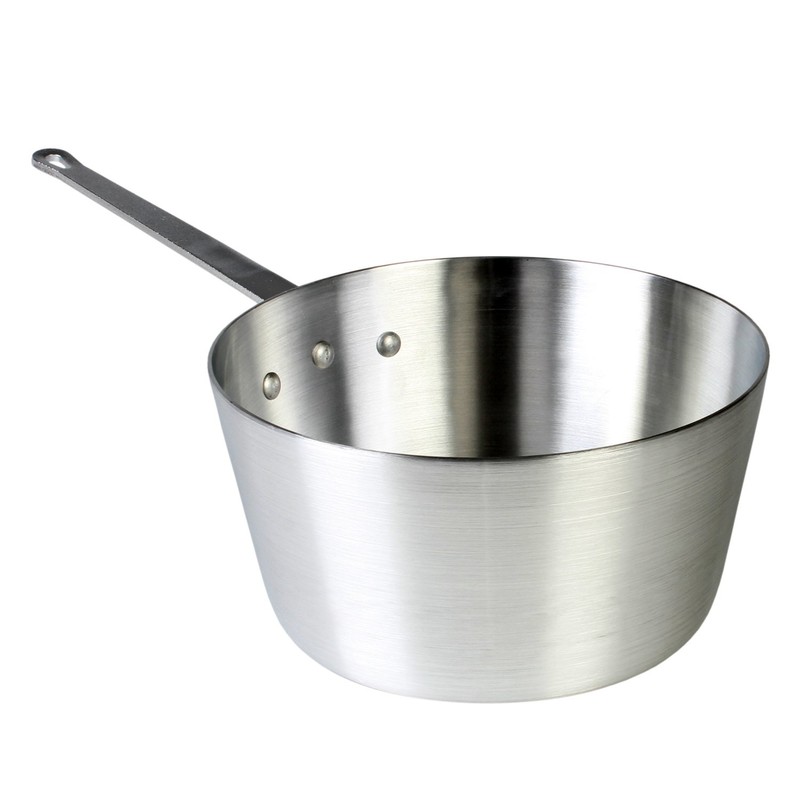 7 Quart aluminum sauce pan. 3 mm thick aluminum commercial grade. NSF listed. Dent resistant. Flat bottom for even heat distribution. Lid sold separately. Item # ALSKSS106