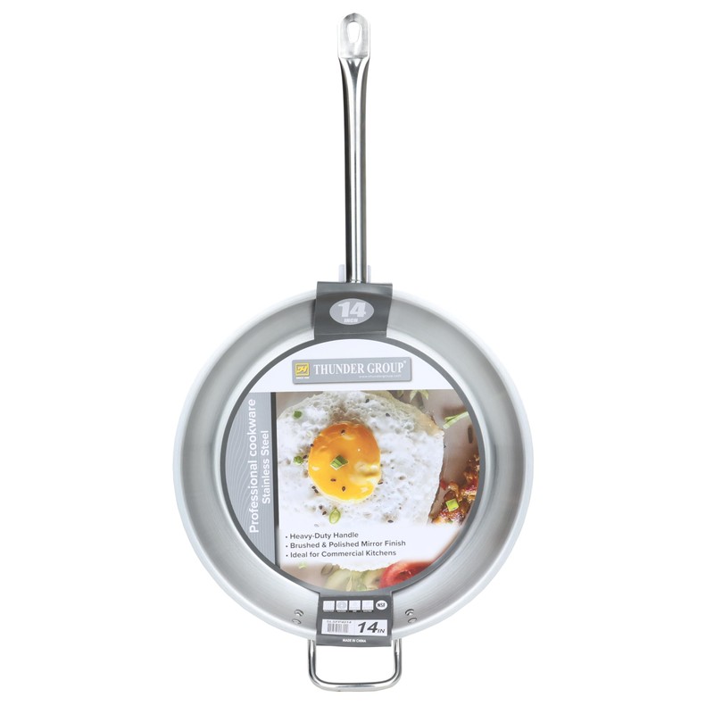 - PREMIUM STAINLESS STEEL FRYING PAN: Crafted from high-grade stainless steel, this 14-inch frying pan is perfect for professional kitchen. The superior construction ensures durability, resisting rust and corrosion while maintaining its sleek appearance, making it a staple in any kitchen. Its generous size provides ample cooking space for all your favorite dishes.