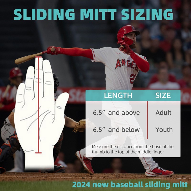 - SIZE: Baseball sliding mitt youth size dimensions (9.8" L x 5" W x 1.75" H), generally suggested for ages 9-13 but, if your child has a slimmer build, please carefully compare their measurements to the sizing dimensions. Pay close attention to the 5" palm width shown in the dimensional photo