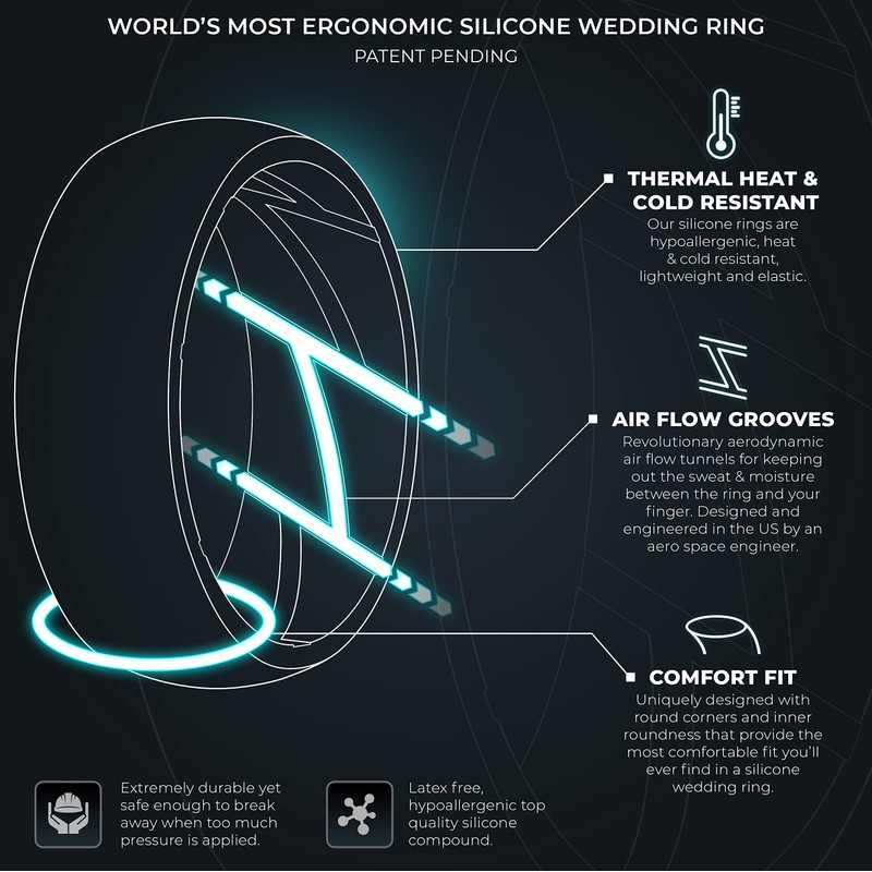 - Silicona flexible, de grado superior, hipoalergénica: nuestra alianza de silicona está hecha de silicona flexible, de alta calidad, no tóxica, duradera, segura. Diseñado para romperse a 19.5 kg de presión. La flexibilidad de este anillo es perfecta para aquellos con grandes nudillos o con dedos hinchados temporalmente.