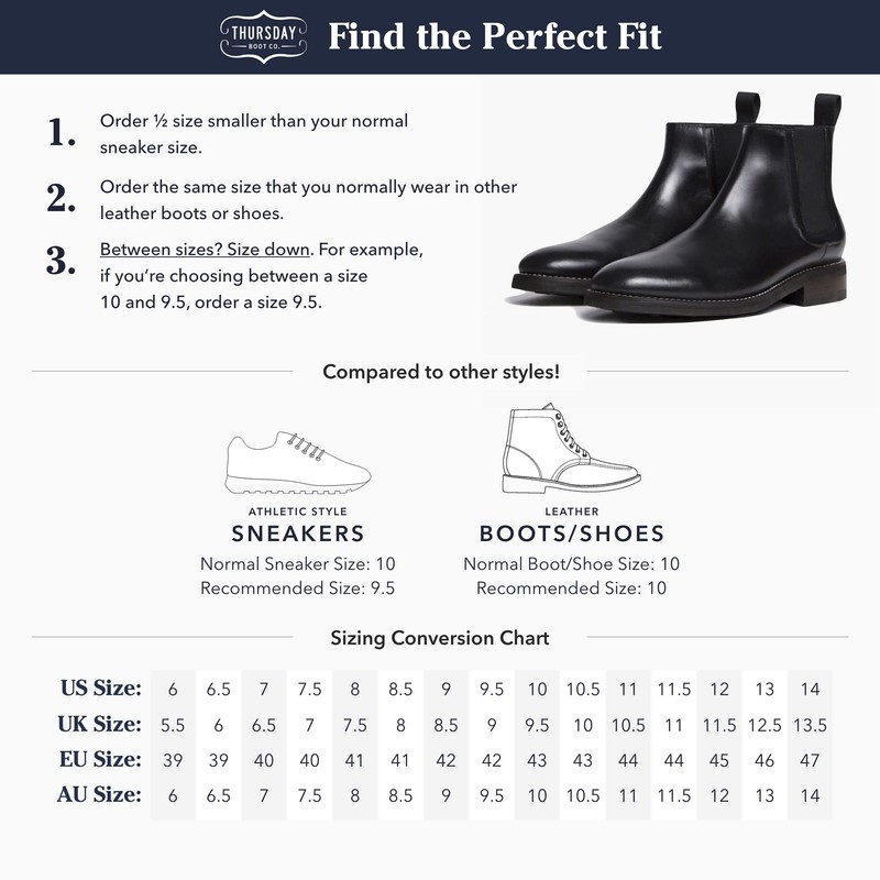 - THE PERFECT FIT - We recommend ordering the size you typically wear in leather boots or dress shoes, or ½ size smaller than you typically wear in sneakers. If you have any questions, need help finding your size, or need to exchange for a different size, our team is always here to help! (Last: Encore)