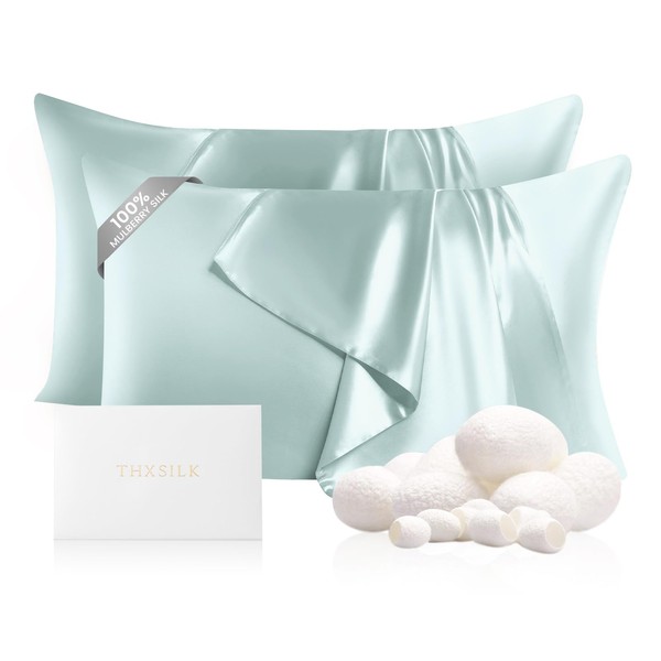 THXSILK Set of 2 100% Mulberry Silk Pillowcase for Hair and Skin Health, 22 Momme Soft and Smooth Pillowcases with Hidden Zipper, Both Sides Premium Grade 6A+ Silk, Standard 20"x26", Light Blue