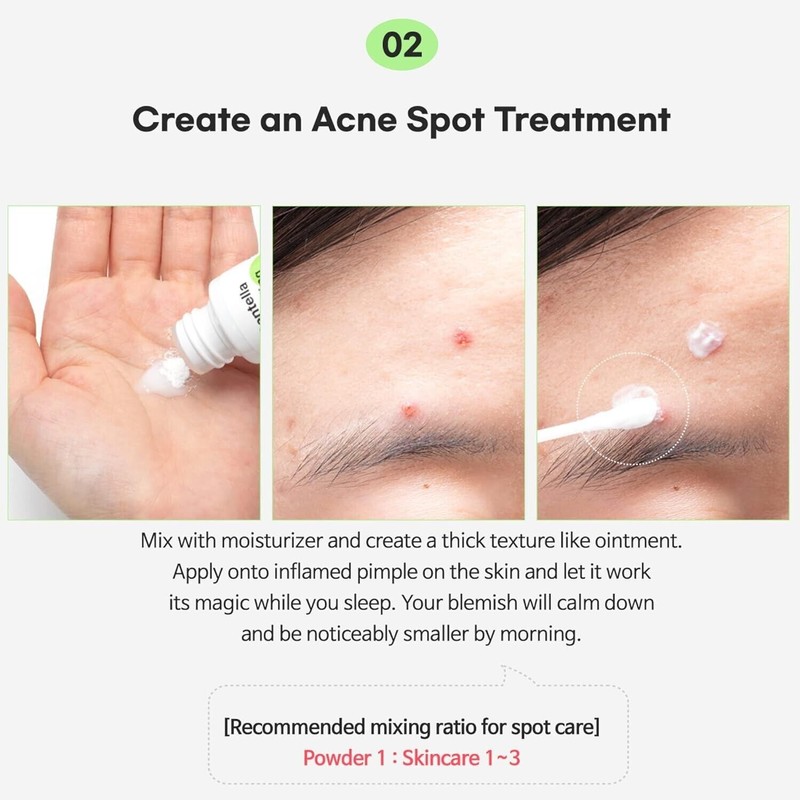 - From skincare to base makeup, blend the Centella powder with whatever you want and boost up the calming and soothing of the angry red spots.