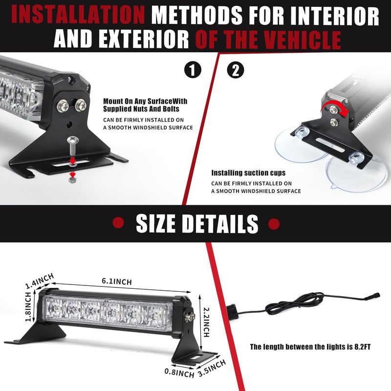 - 【Easy to Install】Just need to plug the amber emergency light bar into car power outlet to complete the connection. With the newly upgraded brackets and strong suction cups you can easily install the emergency lights for vehicles on the windshield or bumper grille of the car.