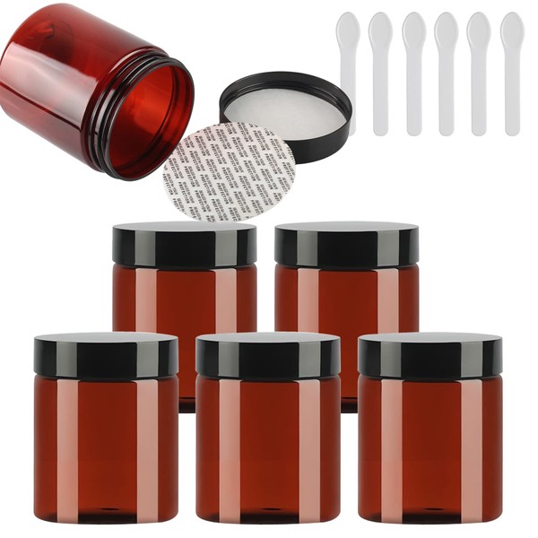 TIANZD Pack of 6 Small 250 ml Brown Plastic Empty Cream Jar with Black Lid 250 g Empty Tin Screw Box Cosmetic Container Jar, 6 Pieces Spatulas