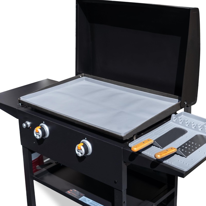 - Keep Your Grill in Tip-Top Condition - Our Blackstone mat is tailor-made for your Blackstone griddles, ensuring a snug, slip-free fit. Plus, it comes with 2 spatulas and a silicone side shelf for convenient utensil storage.