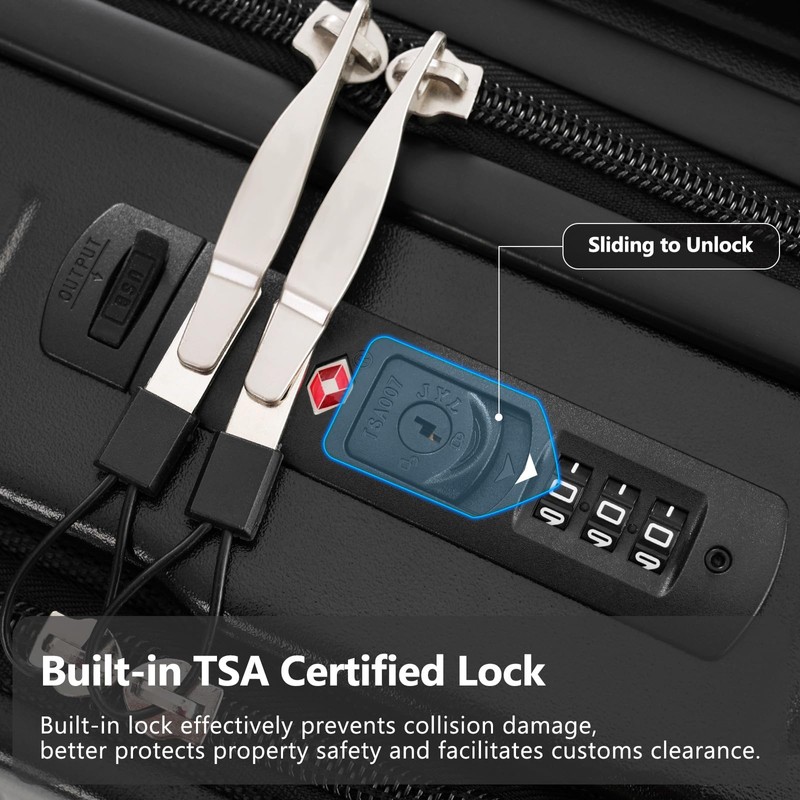 • Carry-on luggage comes with a 3-dial TSA approved lock for security. TSA lock with USB charging port(power bank not included), so you can charge mobile device on the go.