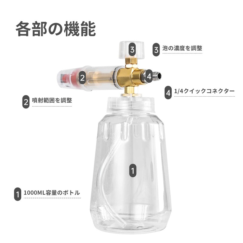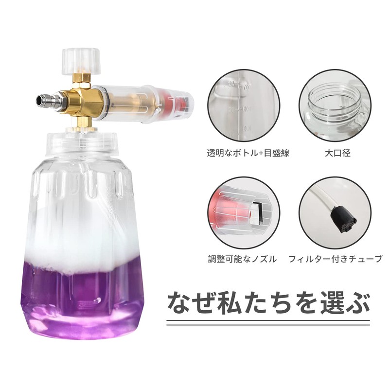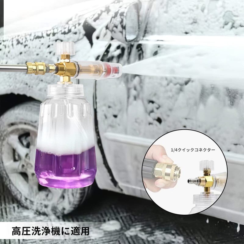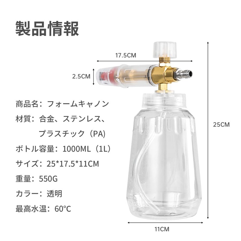 - Material: Alloy, stainless steel, plastic; Bottle capacity: 33.8 fl oz (1,000 ml) (1 L); Maximum water temperature: 140°F (60°C). Includes: foam lance bottle, connection adapter, suction tube. Precision-manufactured metal injectors ensure a rich, dense foam with low soap mixing ratio. The clear pot body with scale lines clearly shows the liquid in the bottle and lets you know the liquid capacity in the bottle anytime, anywhere