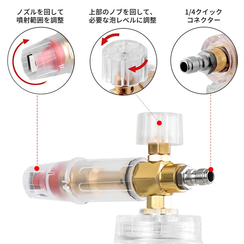 - Adjustable Foam Level: You can adjust the lance spray nozzle to your desired foam state. The top knob adjusts the amount of foam spout, and the nozzle adjusts the spray pattern. Features a variable adjustable spray nozzle for precise mixing and foam production. Variable spray pattern from pencil tip to fan jet Allows cleaning agents and disinfectants to be applied evenly to large surfaces